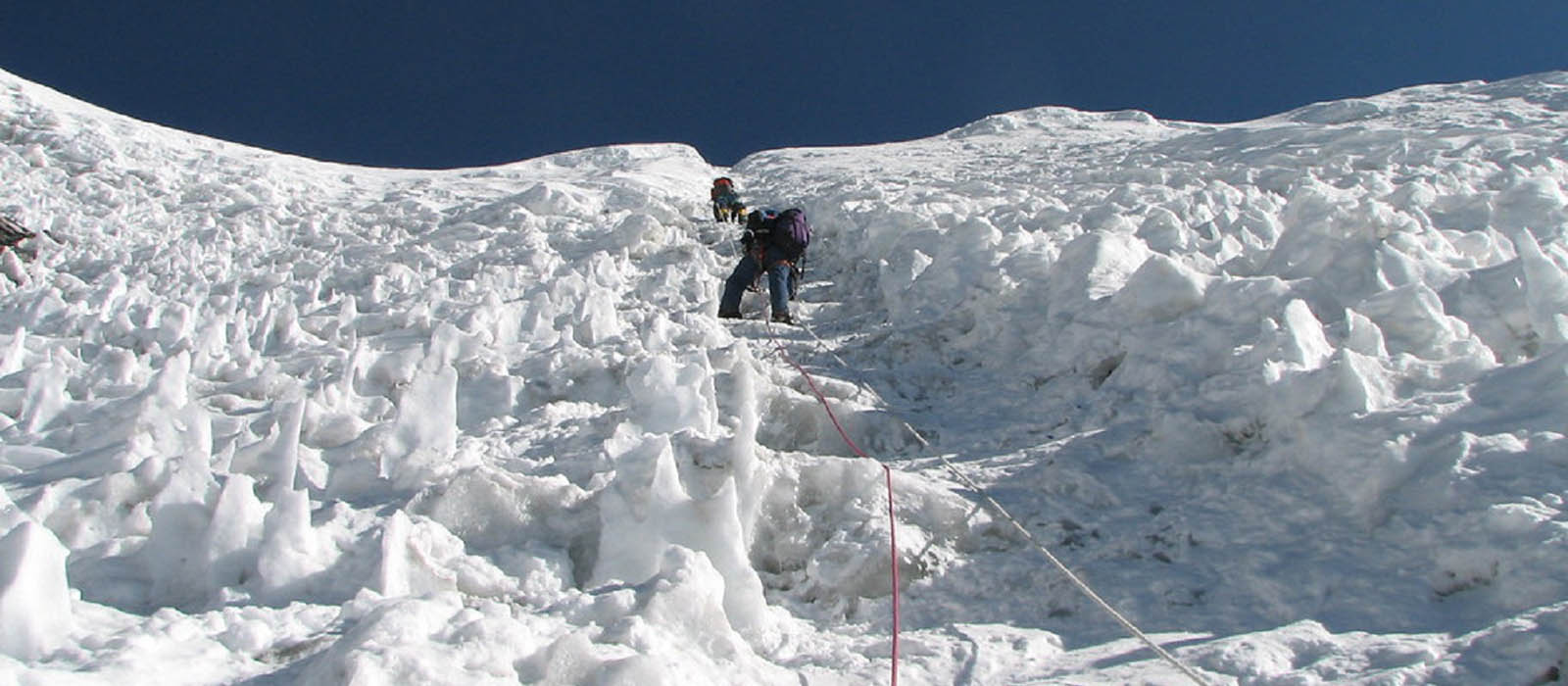 The steep ice wall (40-50°) before the summit and the final narrow ridge are the toughest sections. Climbers must use fixed ropes, ascenders, and crampons for the ascent.